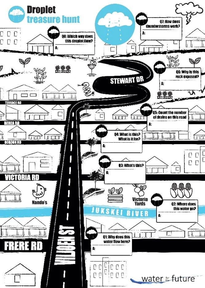 The construction of our Eco Tree Seat provided many opportunities for art adventures and serves as a model for our projects going forward. Children from the area were involved in a mosaic art workshop, and drew their feelings about the state of the nature. A ‘crying cloud’ drawing by a young boy became the official mascot and part of the Water Droplet Treasure Hunt which started at the Tree Seat and was aimed at kids learning about the river, and how water behaves in the catchment.
